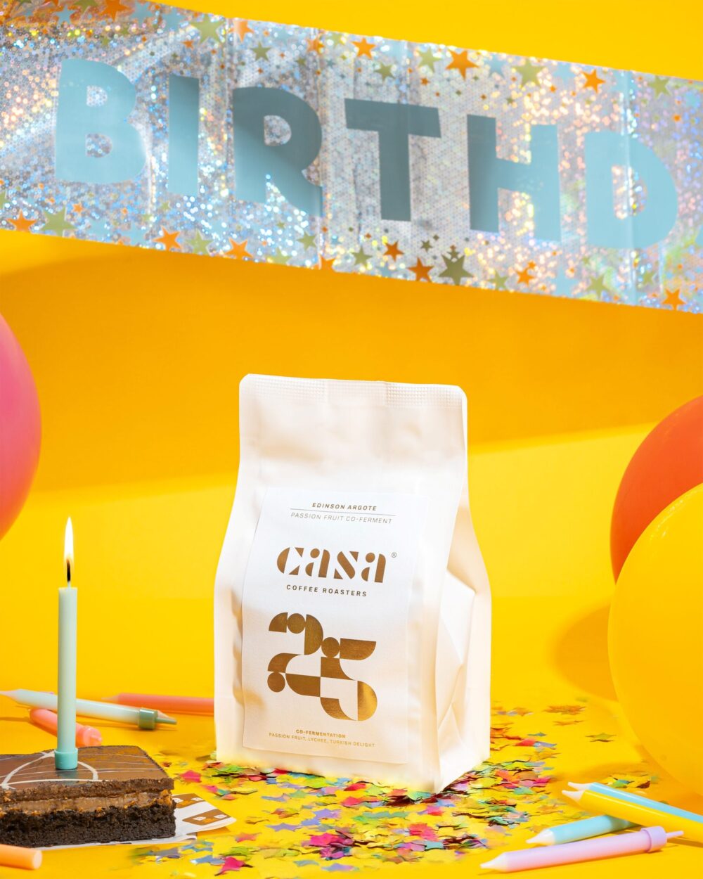 To celebrate our 25th anniversary, we have a special coffee brought to us by Edinson Argote from Colombia, a 100% Caturra variety co-fermented with passion fruit and yeast. We called the coffee simply Twenty Five